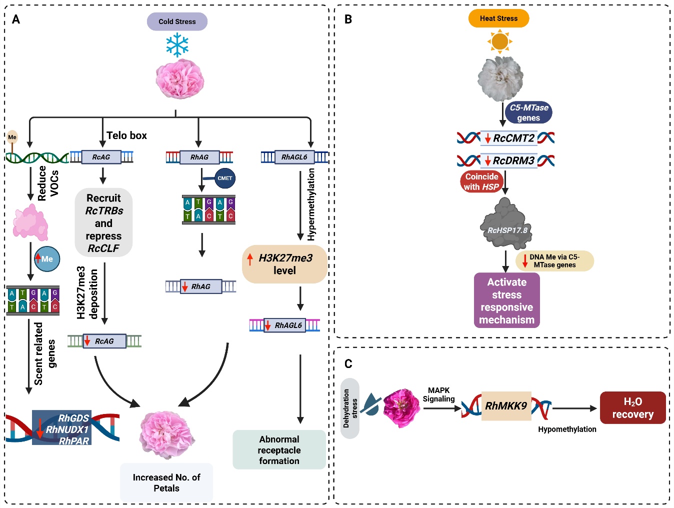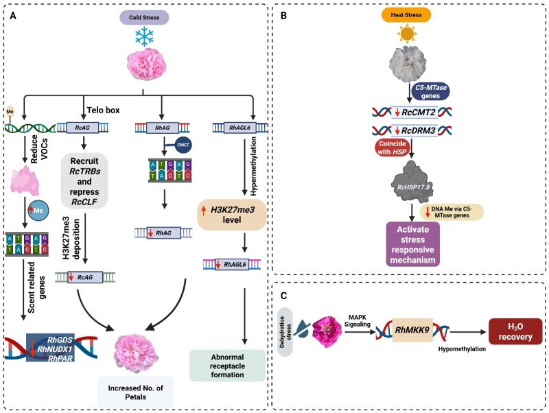 图3. DNA甲基化介导蔷薇属植物在温度和水分胁迫下的调控反应