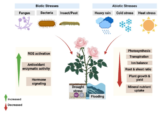 图1. 蔷薇属植物对生物和非生物胁迫的响应及其适应性反应