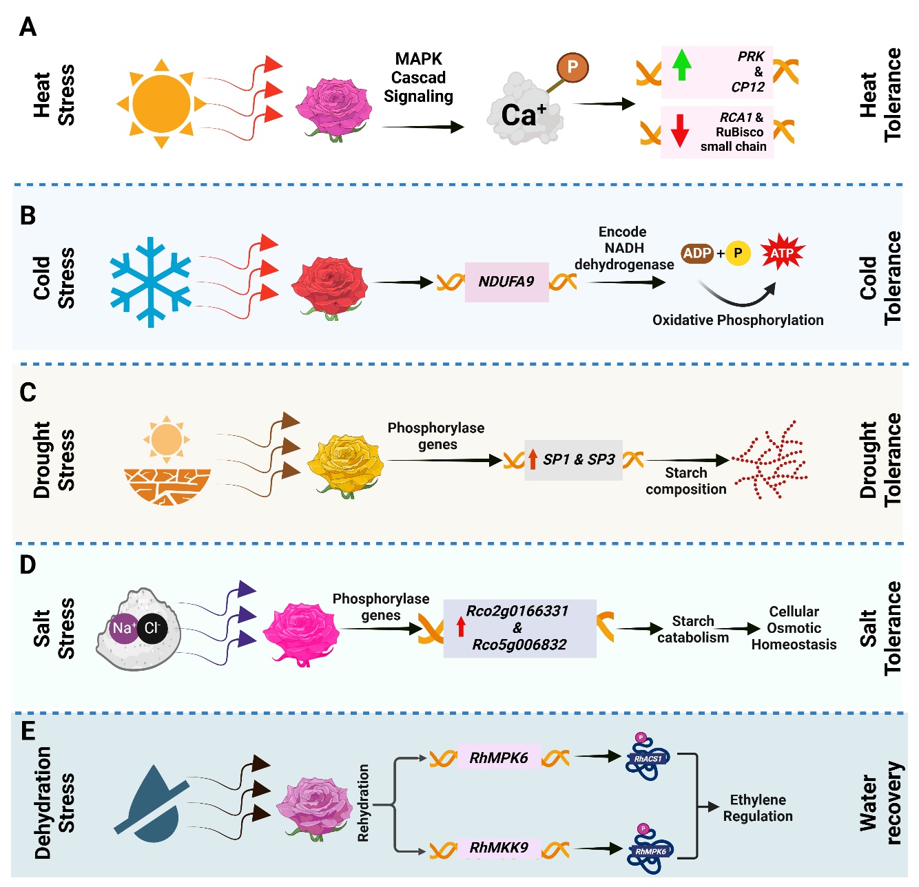 图2. 磷酸化介导的调控机制增强蔷薇属植物的非生物胁迫耐受性