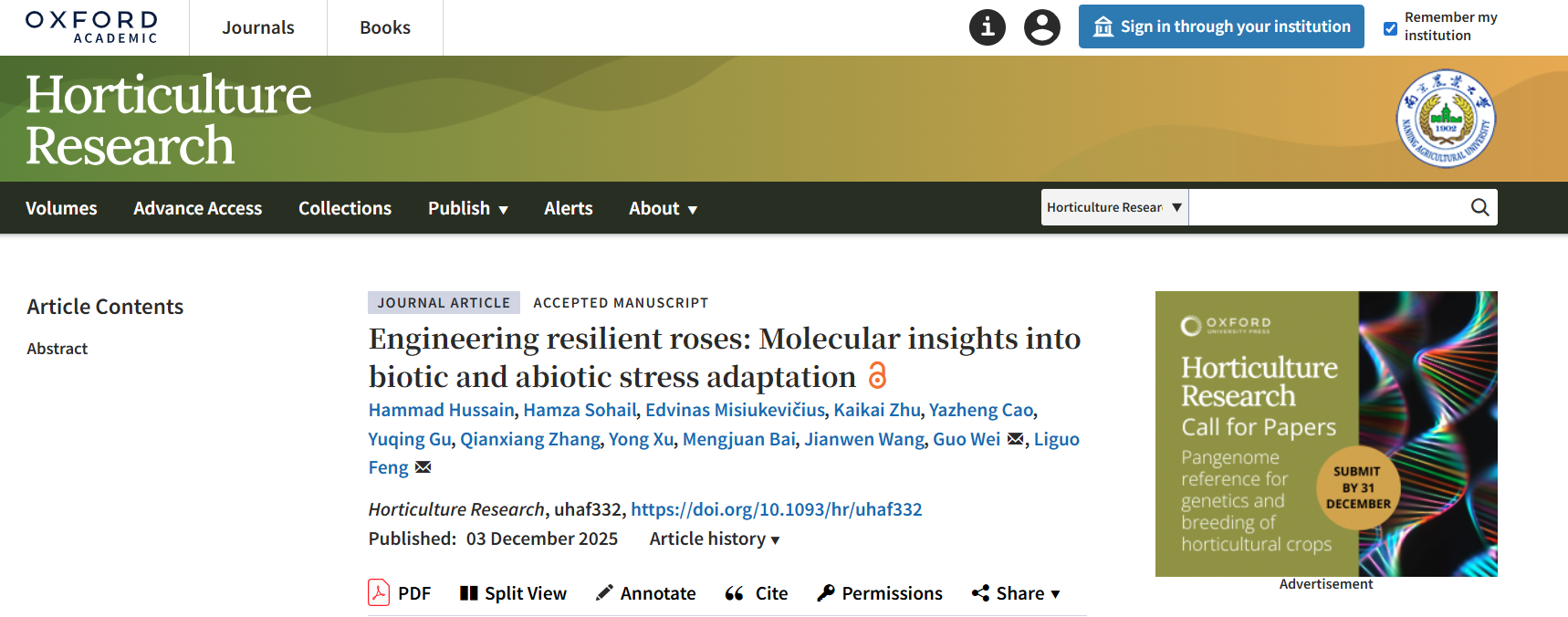 近日,国际园艺领域TOP期刊《Horticulture Research》(影响因子8.5,五年影响因子9.1)在线发表了我会常务理事冯立国教授团队题为“Engineering resilient roses: Molecular insights into biotic and abiotic stress adaptation”的综述论文,系统总结了玫瑰等蔷薇属植物生物与非生物胁迫适应性分子机制相关研究进展。